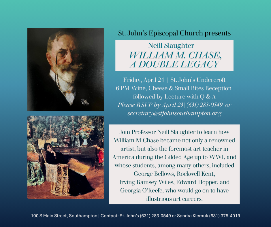Experience an evening of art and history at St. John’s Episcopal Church in Southampton, NY. Join us for a special presentation by Professor Neill Slaughter as he explores the profound impact of William Merritt Chase—not only as a premier Gilded Age artist but as the most influential art teacher of his era.