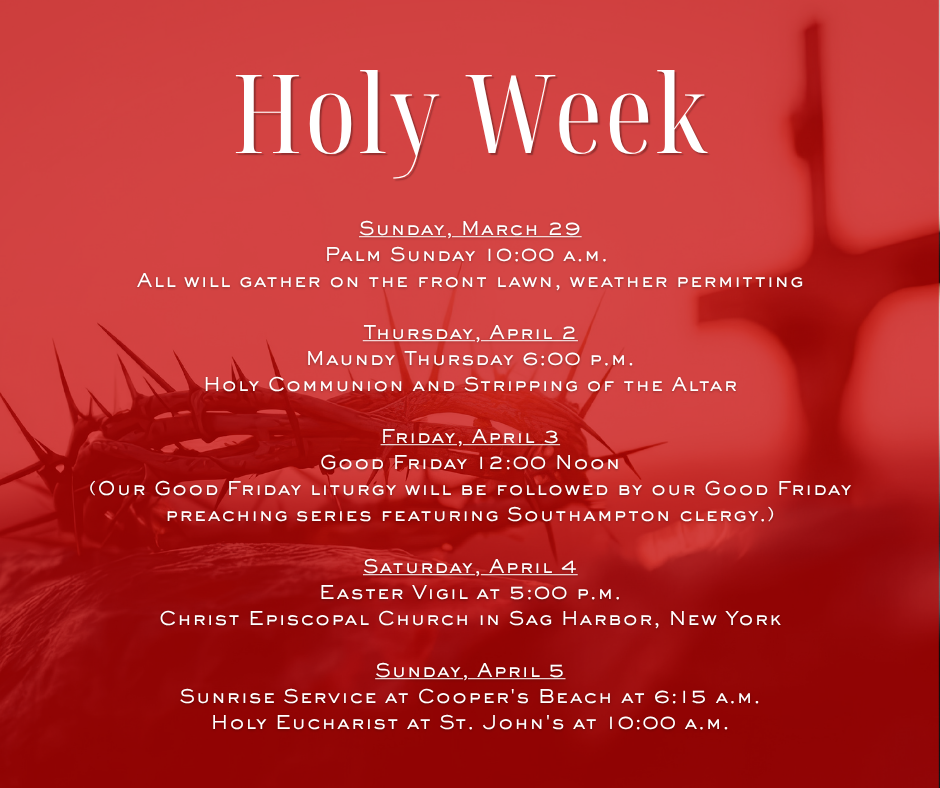 We invite all members of the St. John’s community and visitors to join us for our Holy Week observances. The full schedule of services can also be found here for your convenience. Let us come together in reflection and celebration during this sacred time.